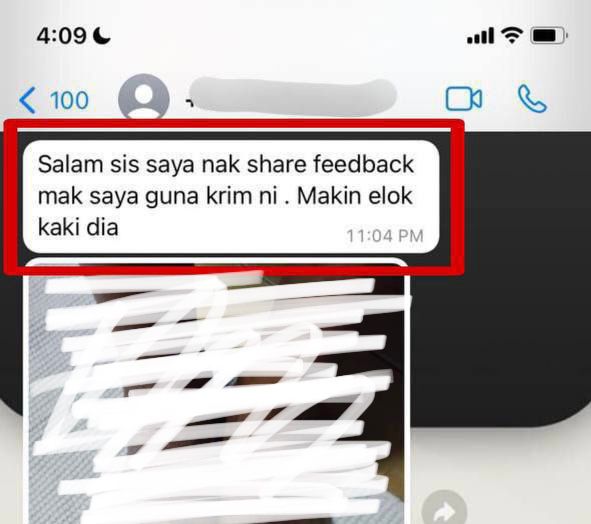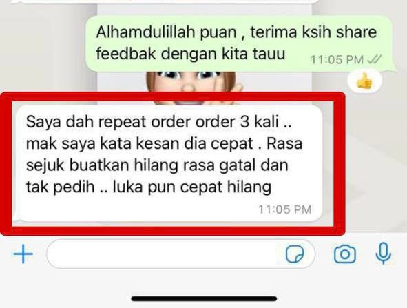 “Dah repeat order 3kali, mak kata kesan cepat. Sejuk buat hilang gatal & pedih. Luka pun cepat hilang.”